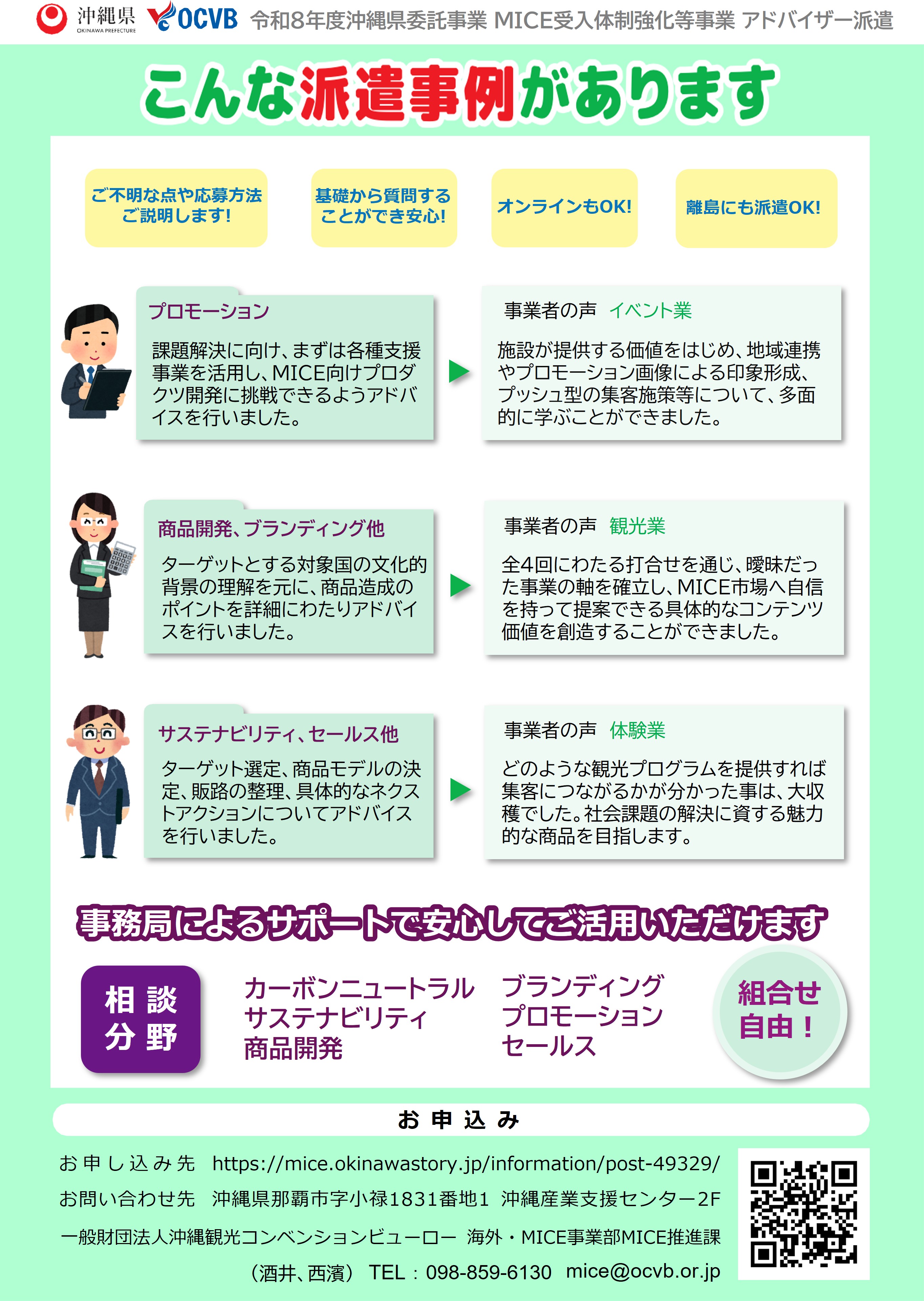 沖縄県及び沖縄観光コンベンションビューローでは、安全・安心なMICE開催の推進並びにサステナビリティへの対応等、主催者ニーズに応じた能力・技能の向上及びサービスの拡充を図ることを目的として、以下の分野に関する専門アドバイザーの派遣を実施します。